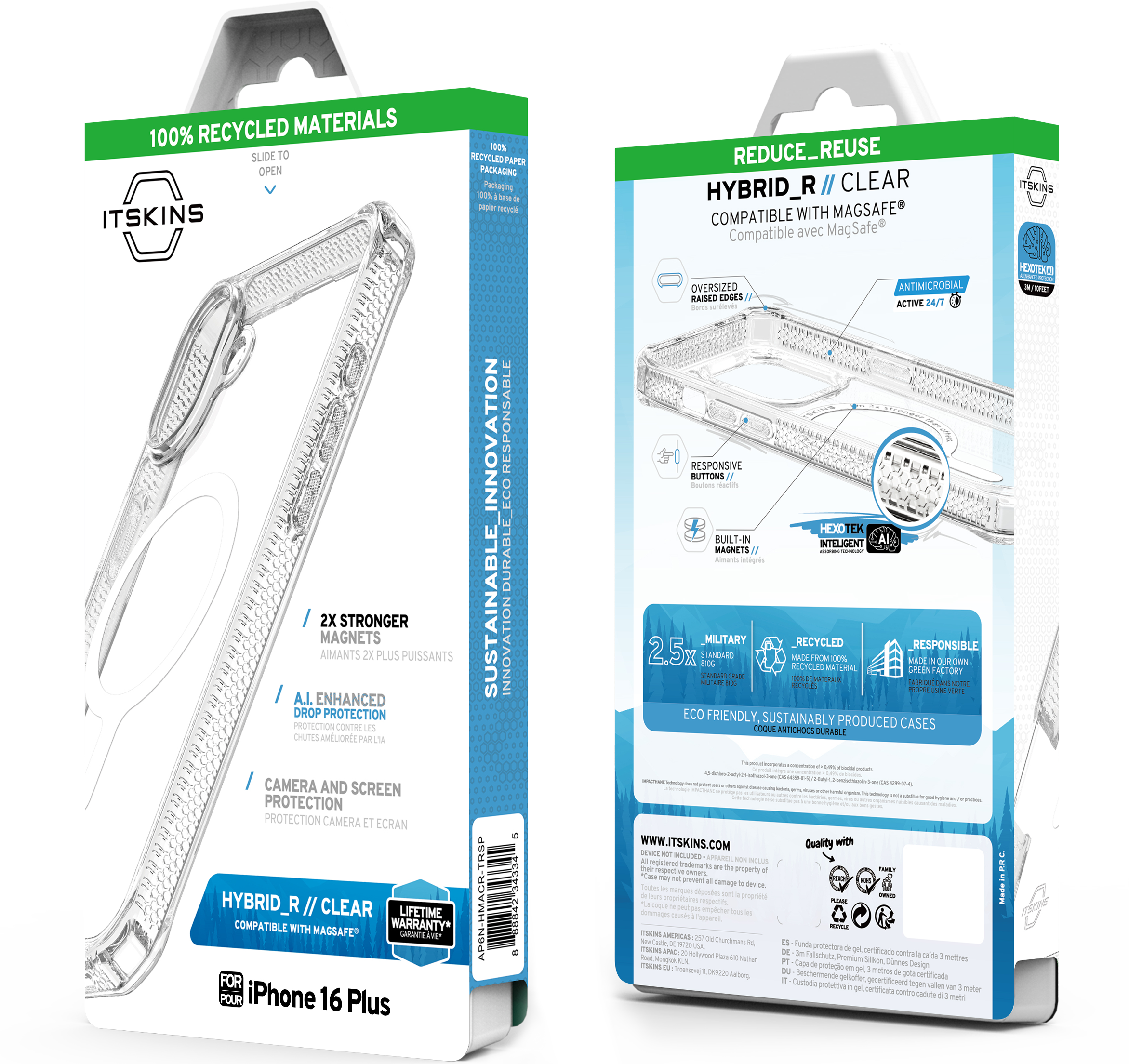HYBRID_R // CLEAR est doté d'aimants intégrés et est certifié par le Global Recycled Standard pour l'utilisation de matériaux 100 % recyclables et une production durable. Il offre une protection premium contre les chutes et une défense antimicrobienne anti-jaunissement.