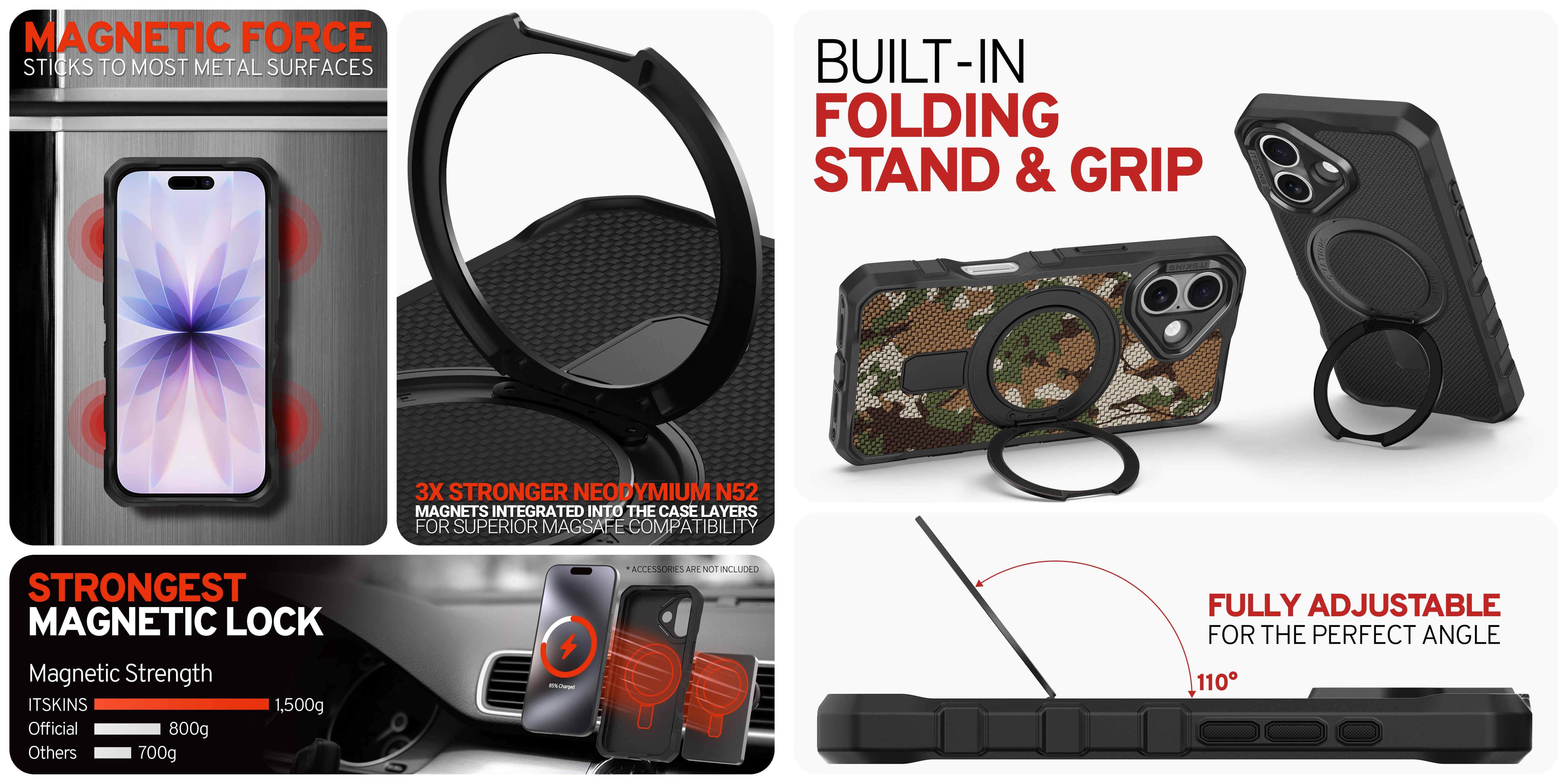 SUPREME_R NYLON : is the ultimate case with numerous advanced features. It is loaded with extra strong magnets embedded around a folding MagSafe-compatible stand to hold to any metal surfaces. Enhanced with AI technology, it offers superior impact absorption around the interior perimeter, protecting your device from drops up to 4.5M / 15 Feet.