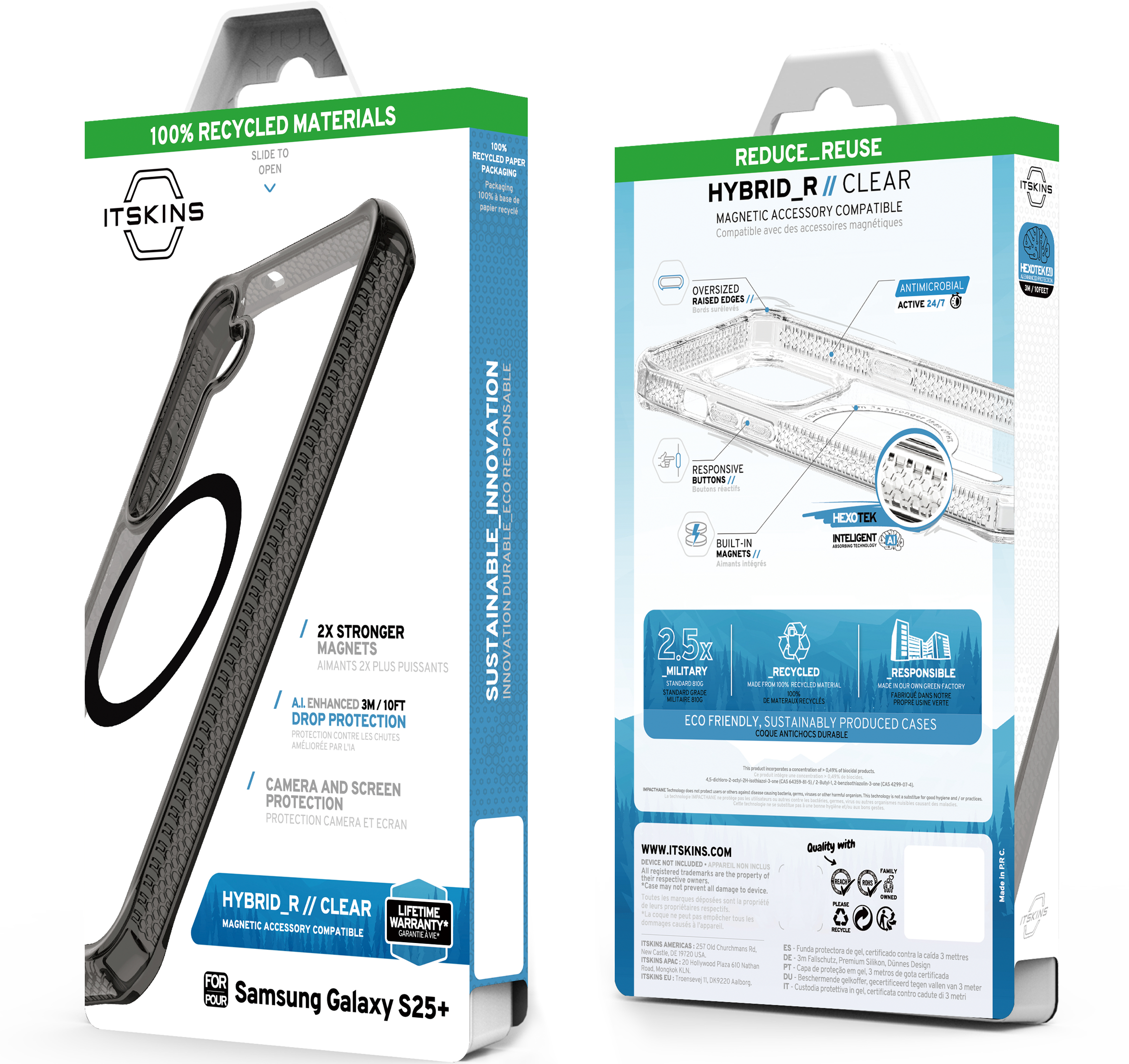 HYBRID_R // CLEAR has built-in magnets and is certified by the Global Recycled Standard for using 100% recyclable materials and produced with sustainably. It delivers premium drop protection and anti-yellowing antimicrobial defense.