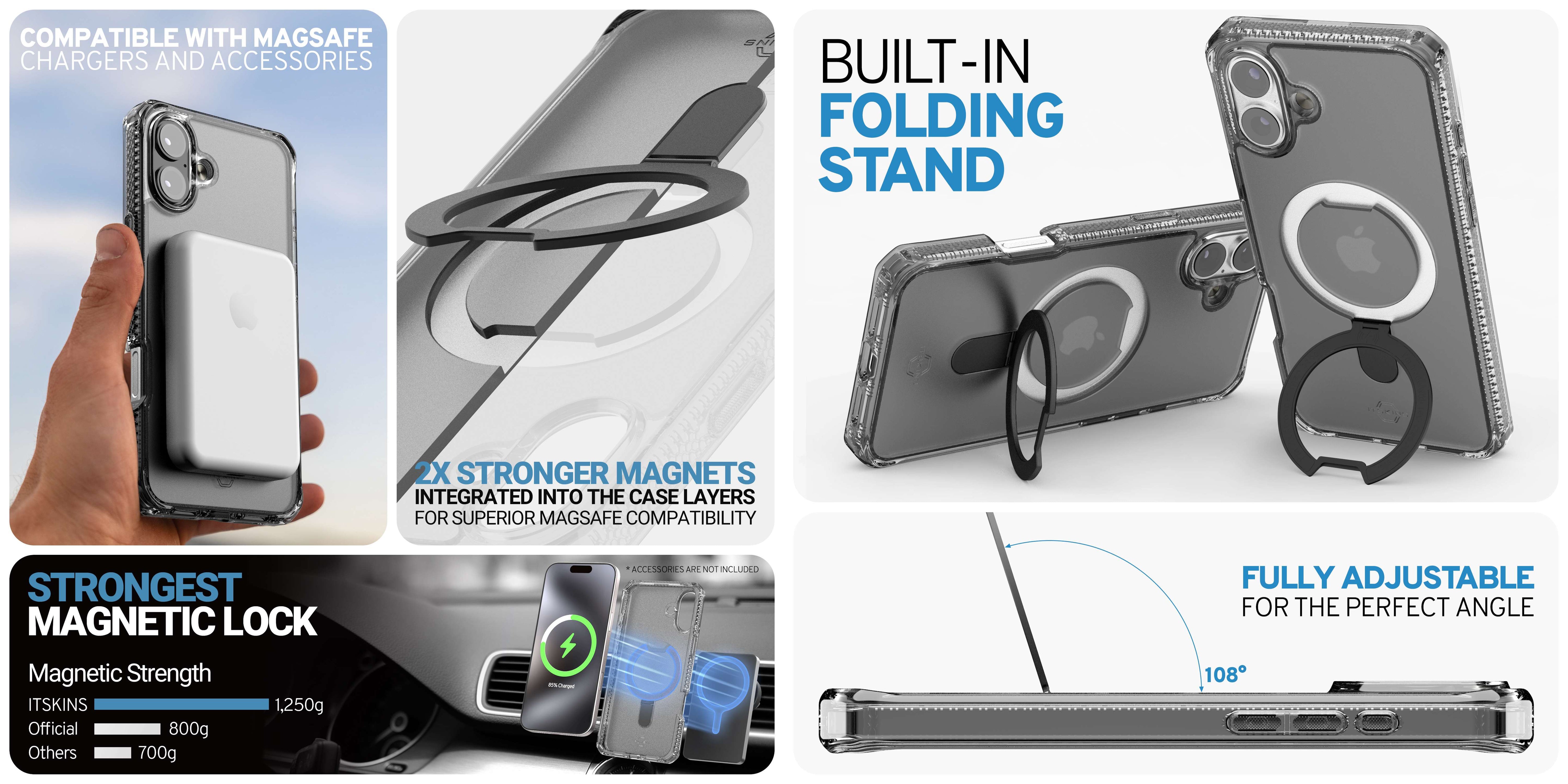 HYBRID R VAPOR STAND : comes packed with features, like a versatile built-in magnetic ring acting as a stand or holder, and is MagSafe-compatible. Designed to sit flush for ease of pocket use. Showcases a matte frosted hardback with a glossy clear bumper, accentuating your phone's titanium trim. Offers AI-enhanced drop protection up to 3M / 10ft, is eco-friendly with Global Recycled Standard Certification, and includes air-pocket corners, antimicrobial protection, and responsive buttons. Geared for the active lifestyle with a Lifetime Warranty.