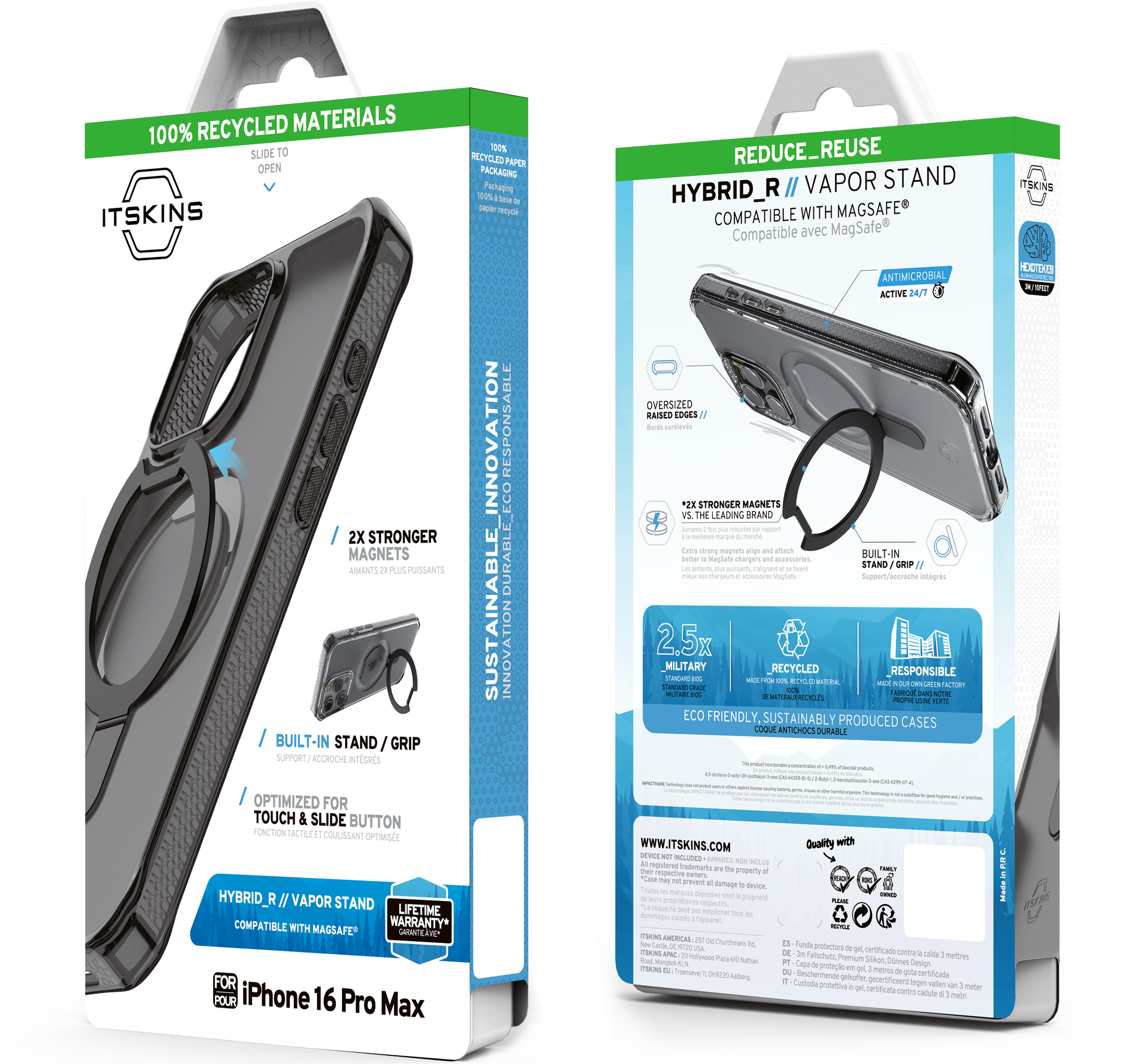 HYBRID_R VAPOR STAND : comes packed with features, like a versatile built-in magnetic ring acting as a stand or holder, and is MagSafe-compatible. Designed to sit flush for ease of pocket use. Showcases a matte frosted hardback with a glossy clear bumper, accentuating your phone's titanium trim. Offers AI-enhanced drop protection up to 3M / 10ft, is eco-friendly with Global Recycled Standard Certification, and includes air-pocket corners, antimicrobial protection, and responsive buttons. Geared for the active lifestyle with a Lifetime Warranty.