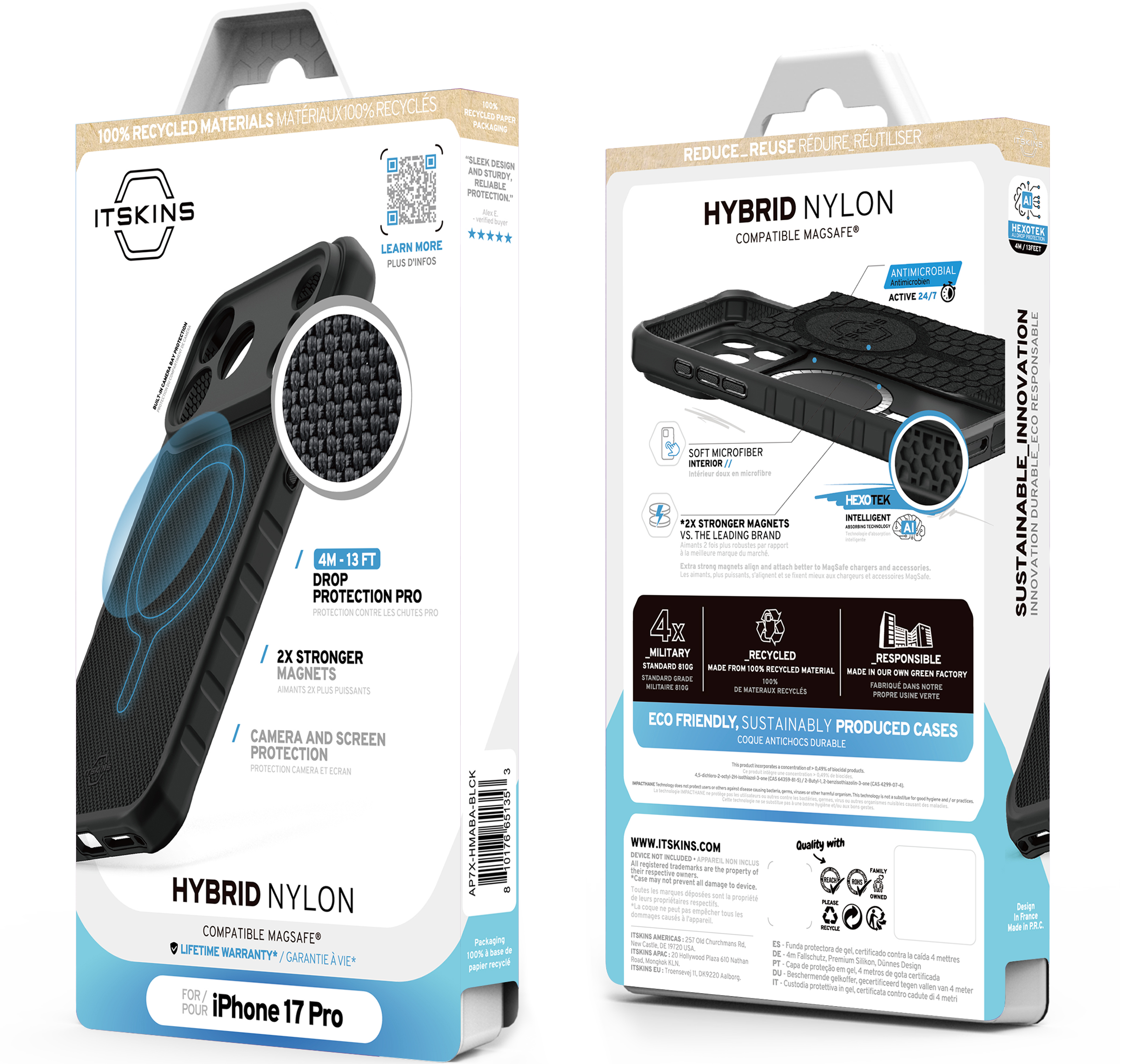 HYBRID_R NYLON : Combines a ballistic nylon weave back for rugged style and durability with a textured solid bumper for enhanced grip. It boasts a 2X Stronger MagSafe for secure attachment, is AI-enhanced to withstand drops up to 3m / 10ft, and is eco-friendly with Global Recycled Standard Certification. Includes features like air-pocket corners, antimicrobial protection, and responsive buttons, making it perfect for an active lifestyle, all supported by a lifetime warranty.