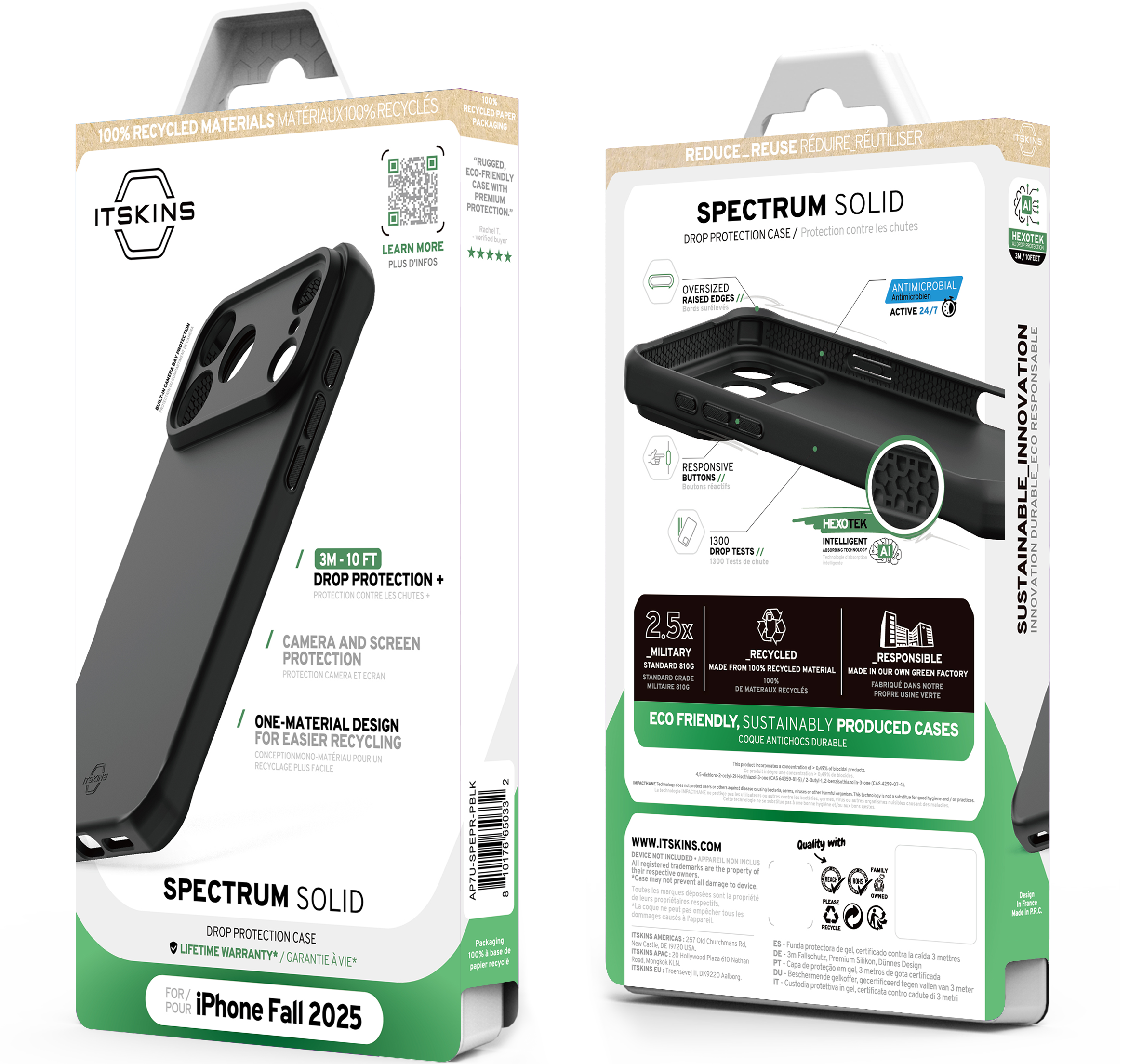 SPECTRUM_R // SOLID has a rugged, solid surface and has been certified by the Global Recycled Standard for using 100% recyclable materials and produced with sustainably. It delivers premium drop protection and antimicrobial defense.