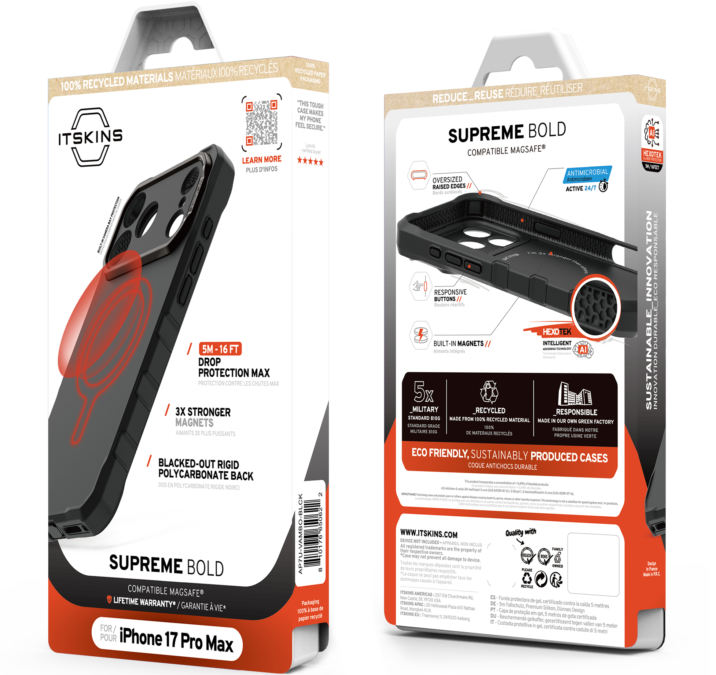 SUPREME R // BOLD : is one of our most protective case. Equipped with a Built-in Metal Plate compatible with car mounts for those needing a stronger attachment option than MagSafe provides. Enhanced with AI technology, it offers superior impact absorption around the interior perimeter, protecting your device from drops up to 4.5M / 15 Feet.