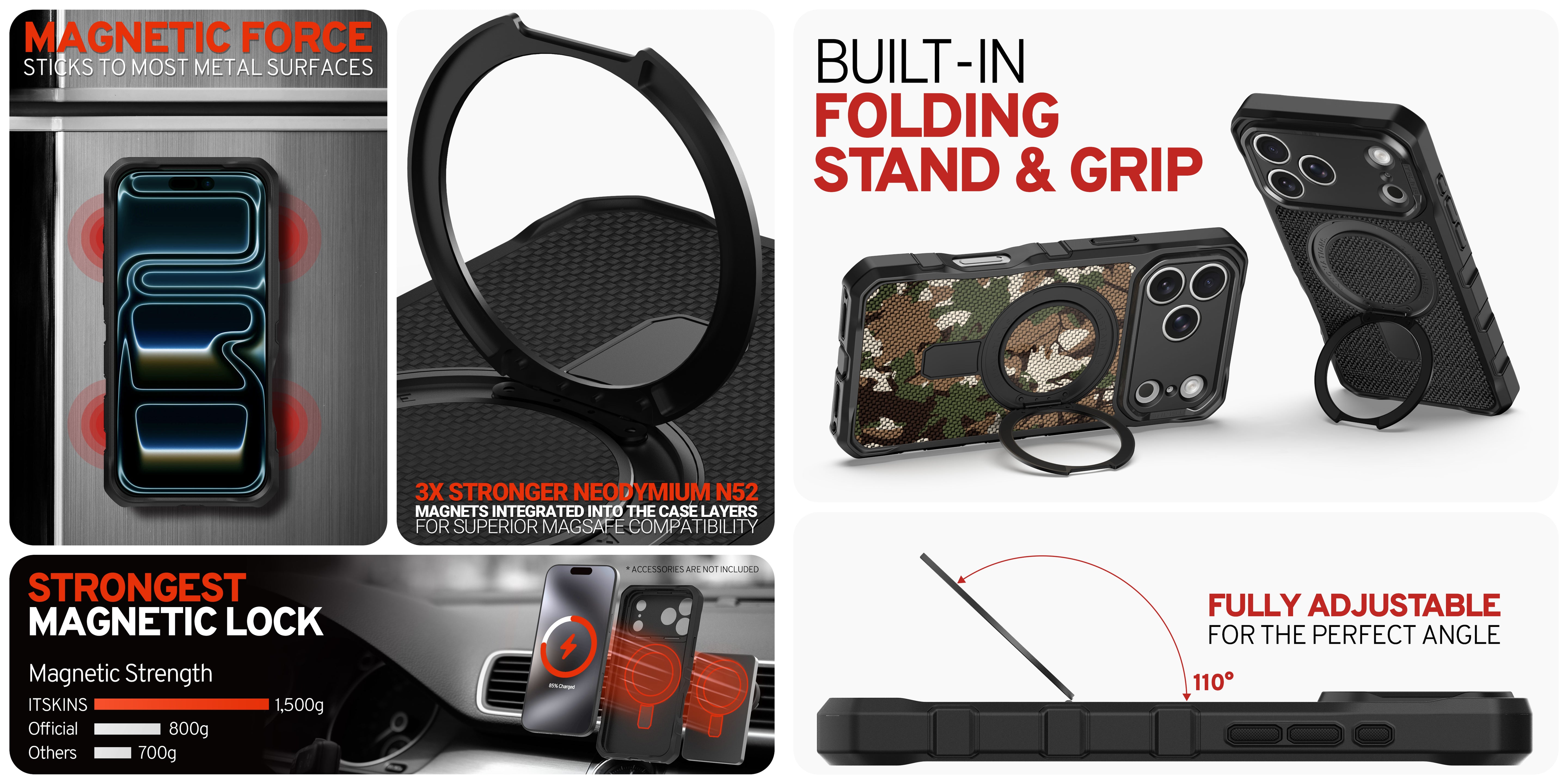 SUPREME_R NYLON : is the ultimate case with numerous advanced features. It is loaded with extra strong magnets embedded around a folding MagSafe-compatible stand to hold to any metal surfaces. Enhanced with AI technology, it offers superior impact absorption around the interior perimeter, protecting your device from drops up to 4.5M / 15 Feet.