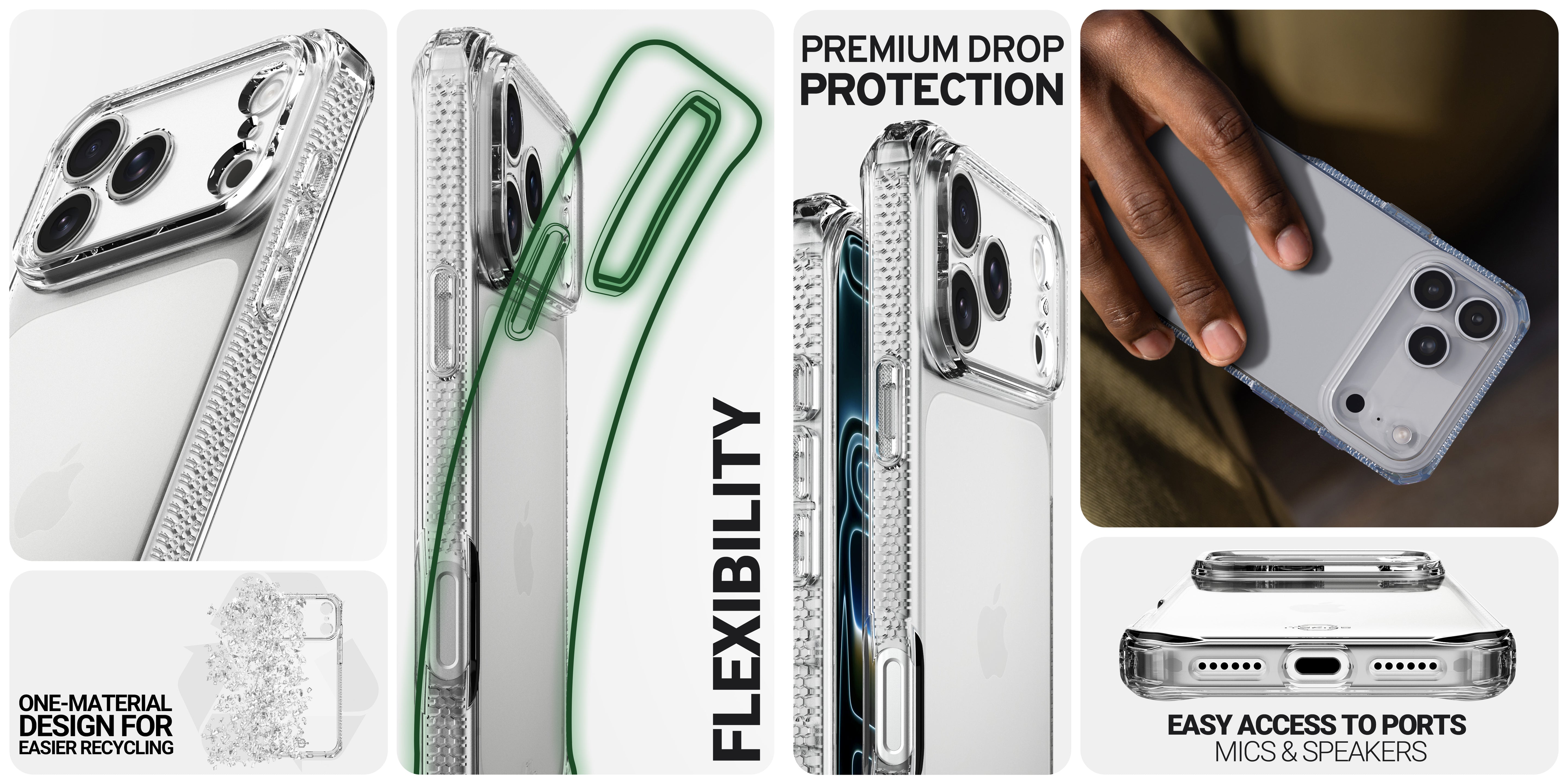 SPECTRUM_R CLEAR : Proprietary True Clear, Certified 100% Recycled, Mono-Material for Simplified Recycling. Offers AI-Enhanced Drop Protection up to 3M / 10FT, Superior Anti-Yellowing, and Antimicrobial Defense.