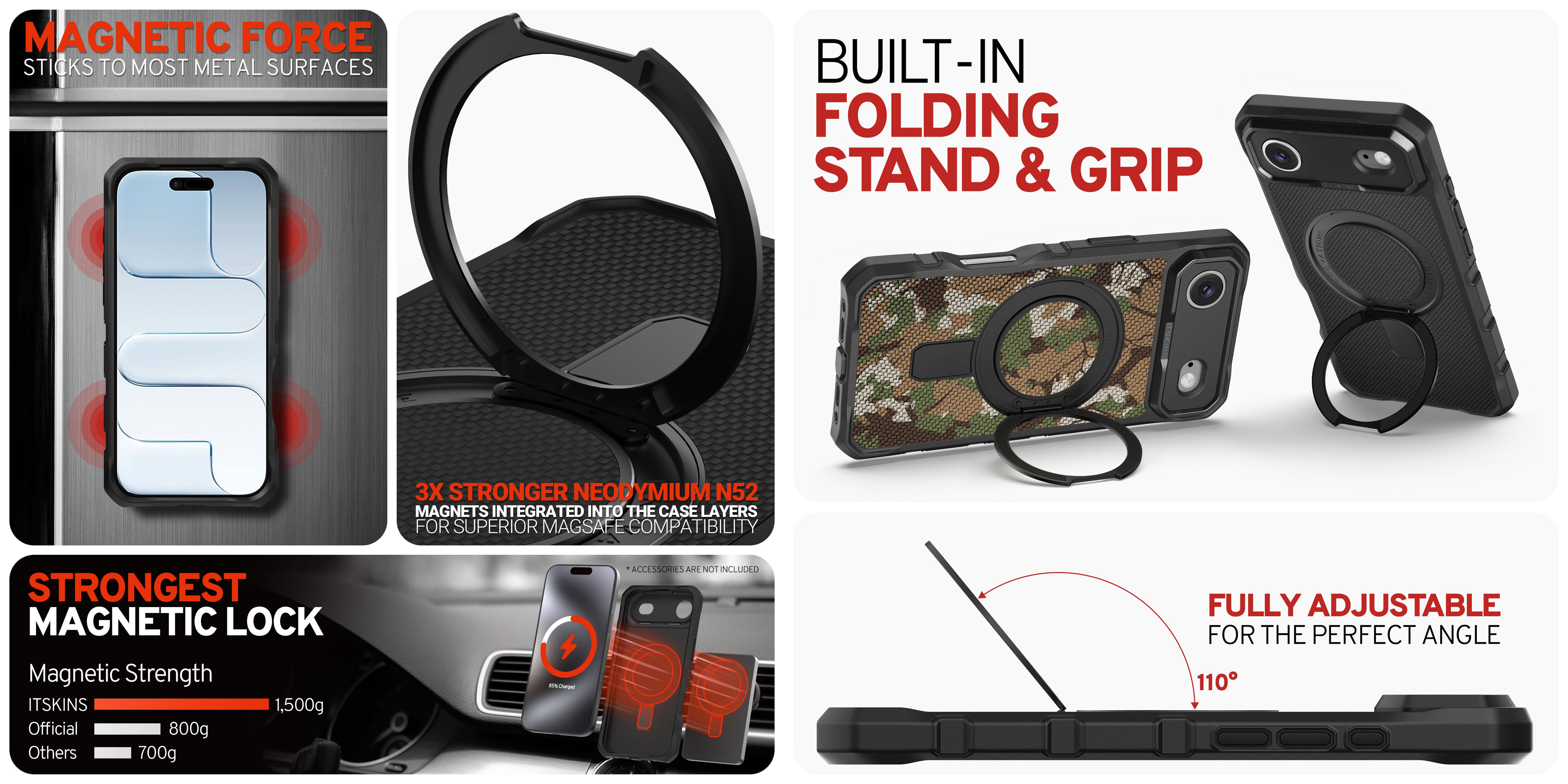 SUPREME_R NYLON : is the ultimate case with numerous advanced features. It is loaded with extra strong magnets embedded around a folding MagSafe-compatible stand to hold to any metal surfaces. Enhanced with AI technology, it offers superior impact absorption around the interior perimeter, protecting your device from drops up to 4.5M / 15 Feet.