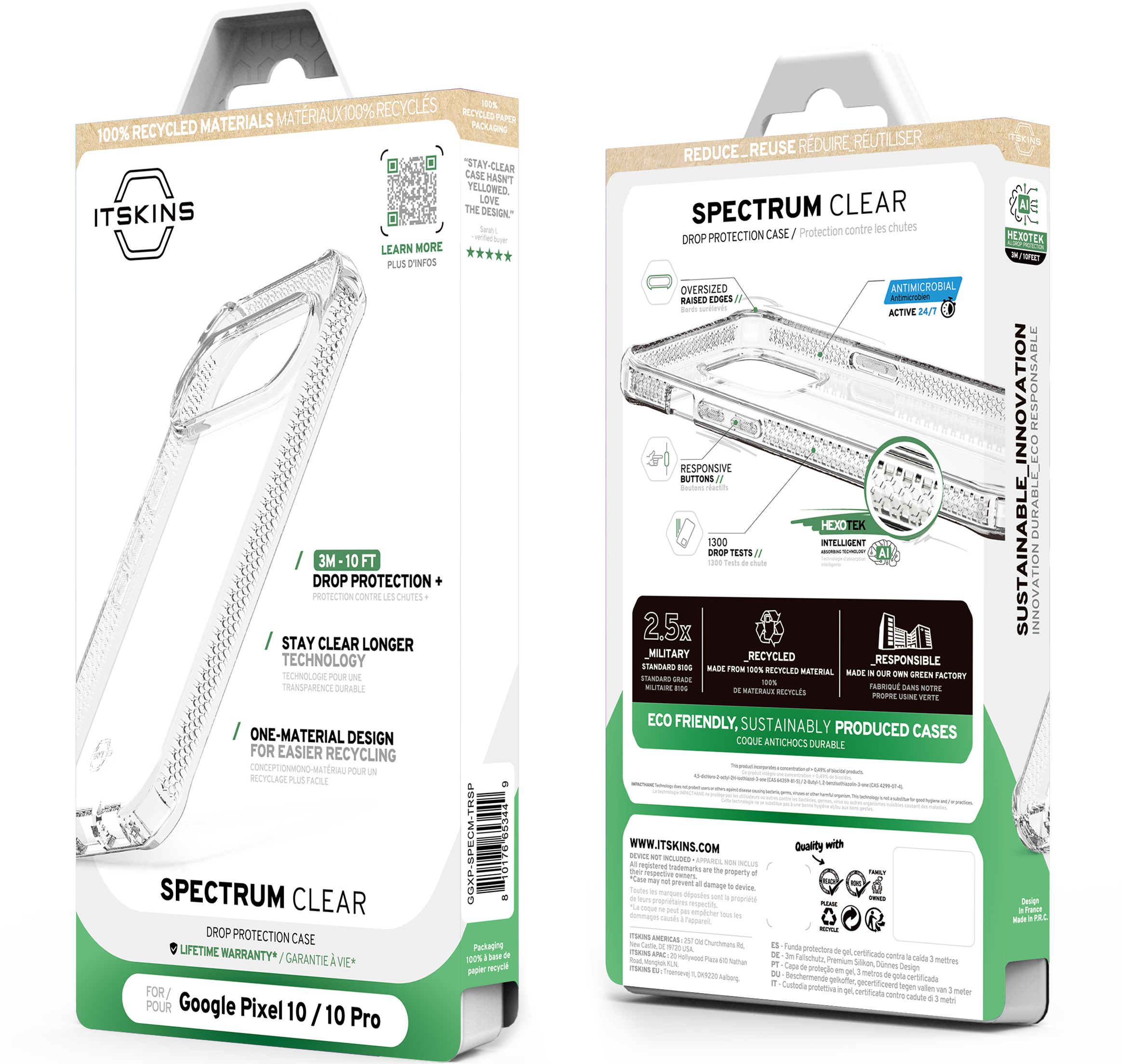 SPECTRUM_R CLEAR : Proprietary True Clear, Certified 100% Recycled, Mono-Material for Simplified Recycling. Offers AI-Enhanced Drop Protection up to 3M / 10FT, Superior Anti-Yellowing, and Antimicrobial Defense.