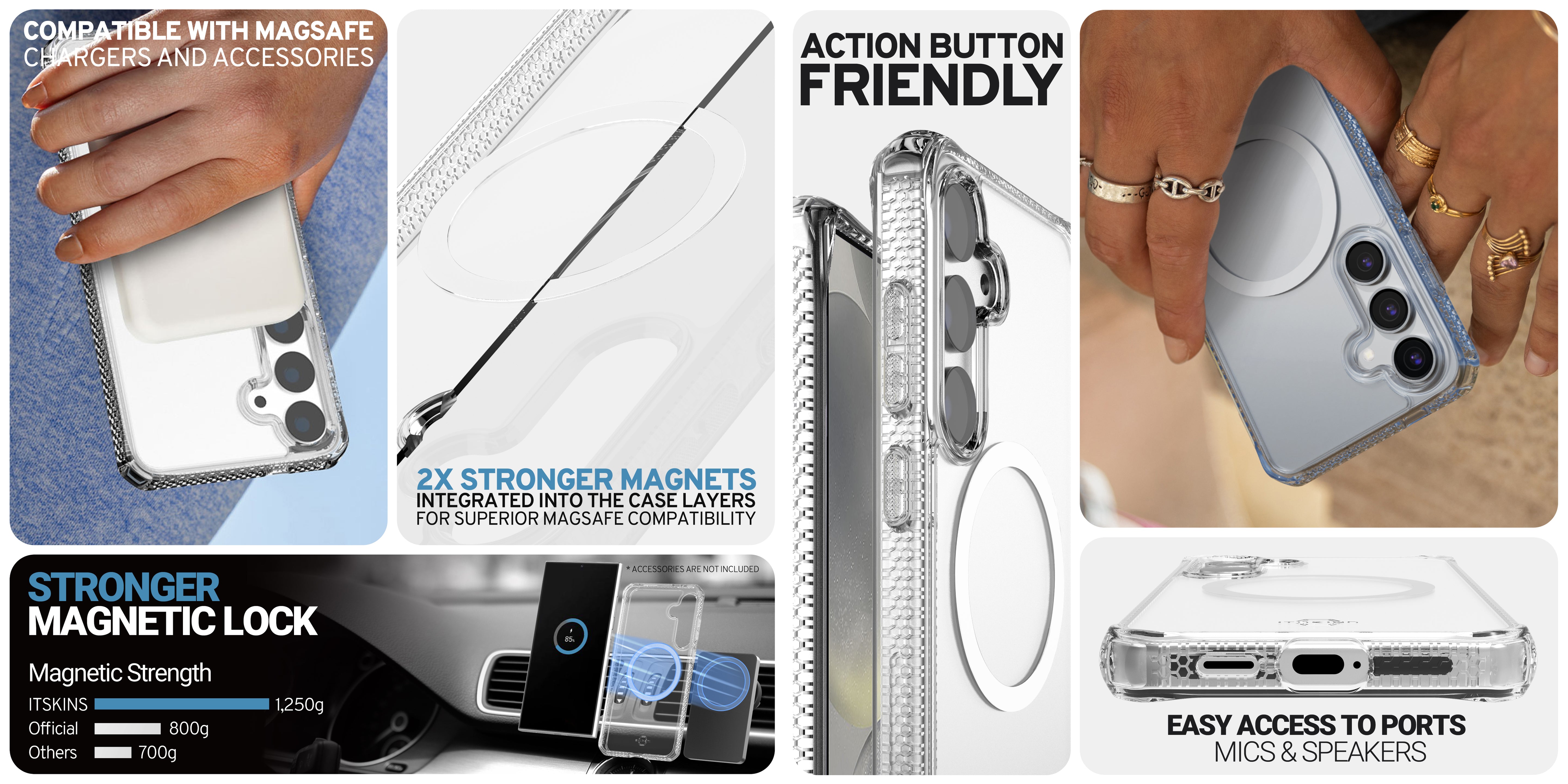 HYBRID_R // CLEAR has built-in magnets and is certified by the Global Recycled Standard for using 100% recyclable materials and produced with sustainably. It delivers premium drop protection and anti-yellowing antimicrobial defense.