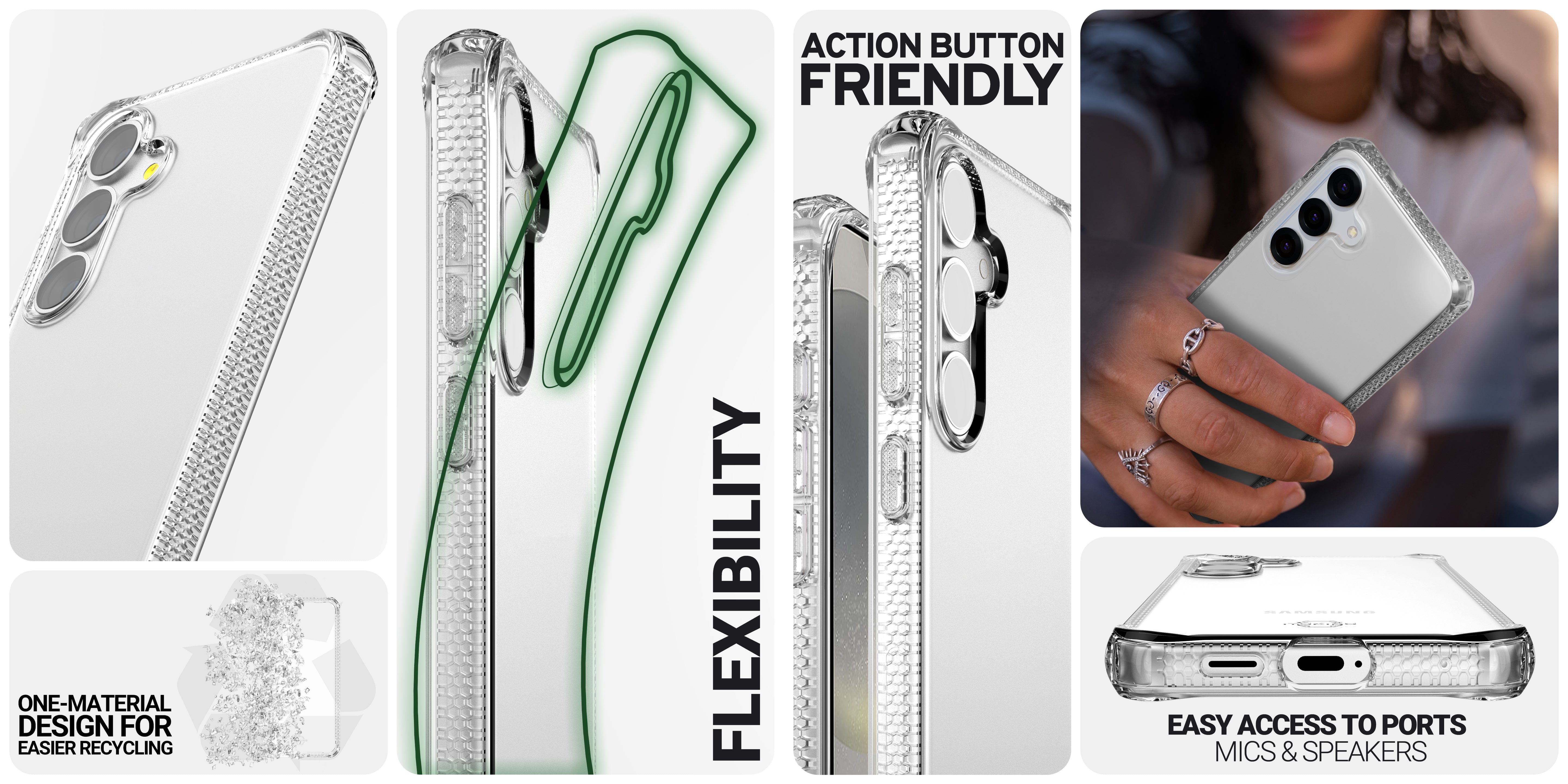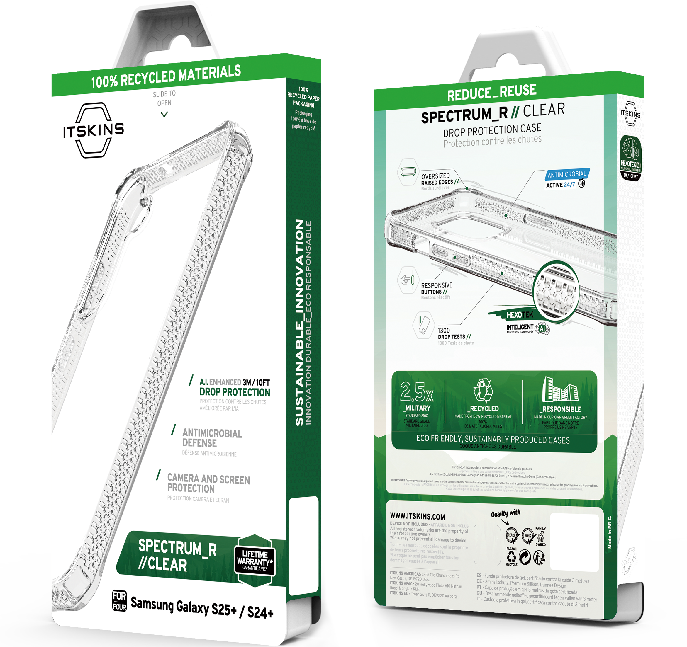 SPECTRUM_R CLEAR : Proprietary True Clear, Certified 100% Recycled, Mono-Material for Simplified Recycling. Offers AI-Enhanced Drop Protection up to 3M / 10FT, Superior Anti-Yellowing, and Antimicrobial Defense.