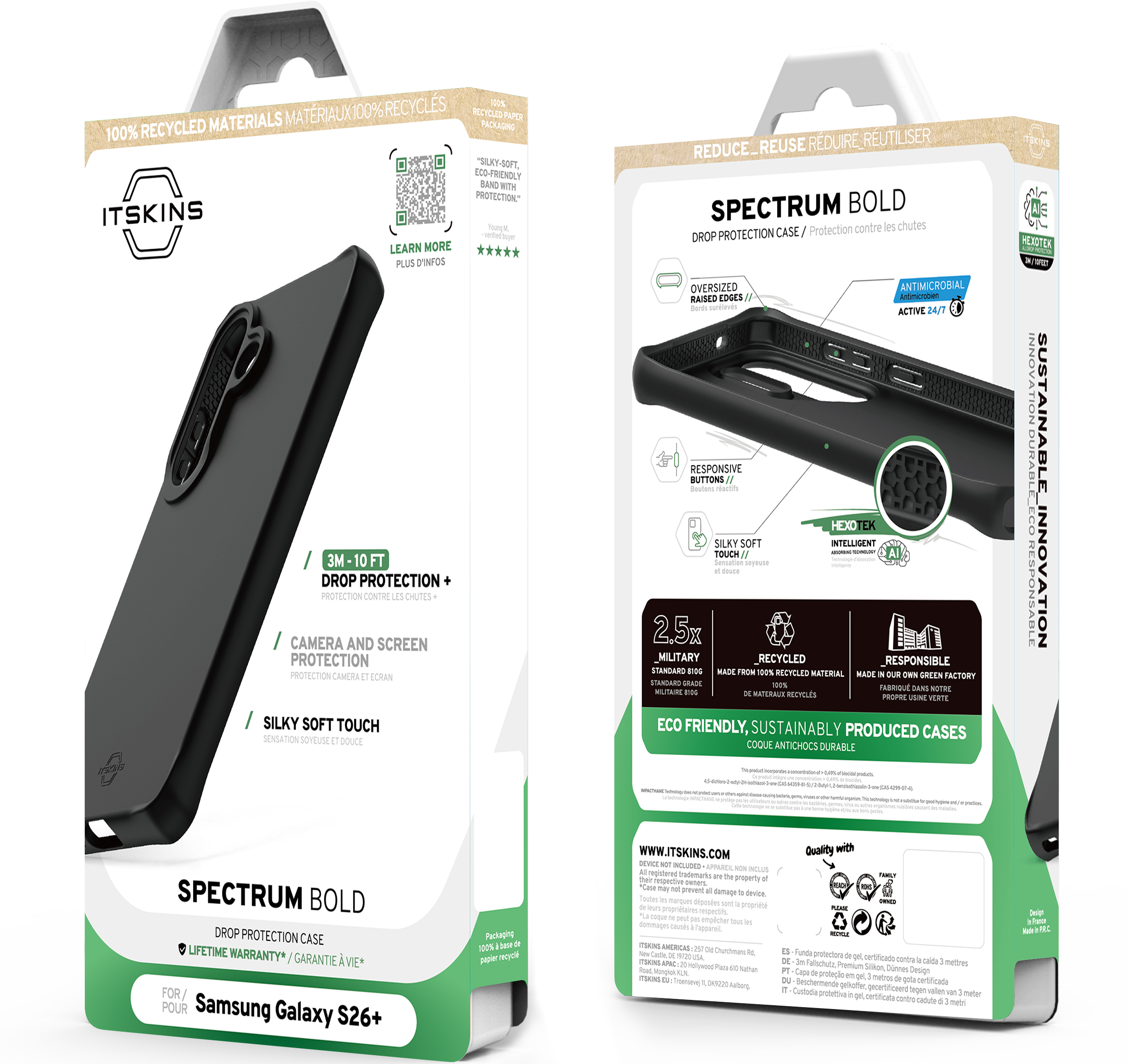 SPECTRUM R // BOLD has a silky-soft feel and has been certified by the Global Recycled Standard for using 100% recyclable materials and produced with sustainably. It delivers premium drop protection and antimicrobial defense.