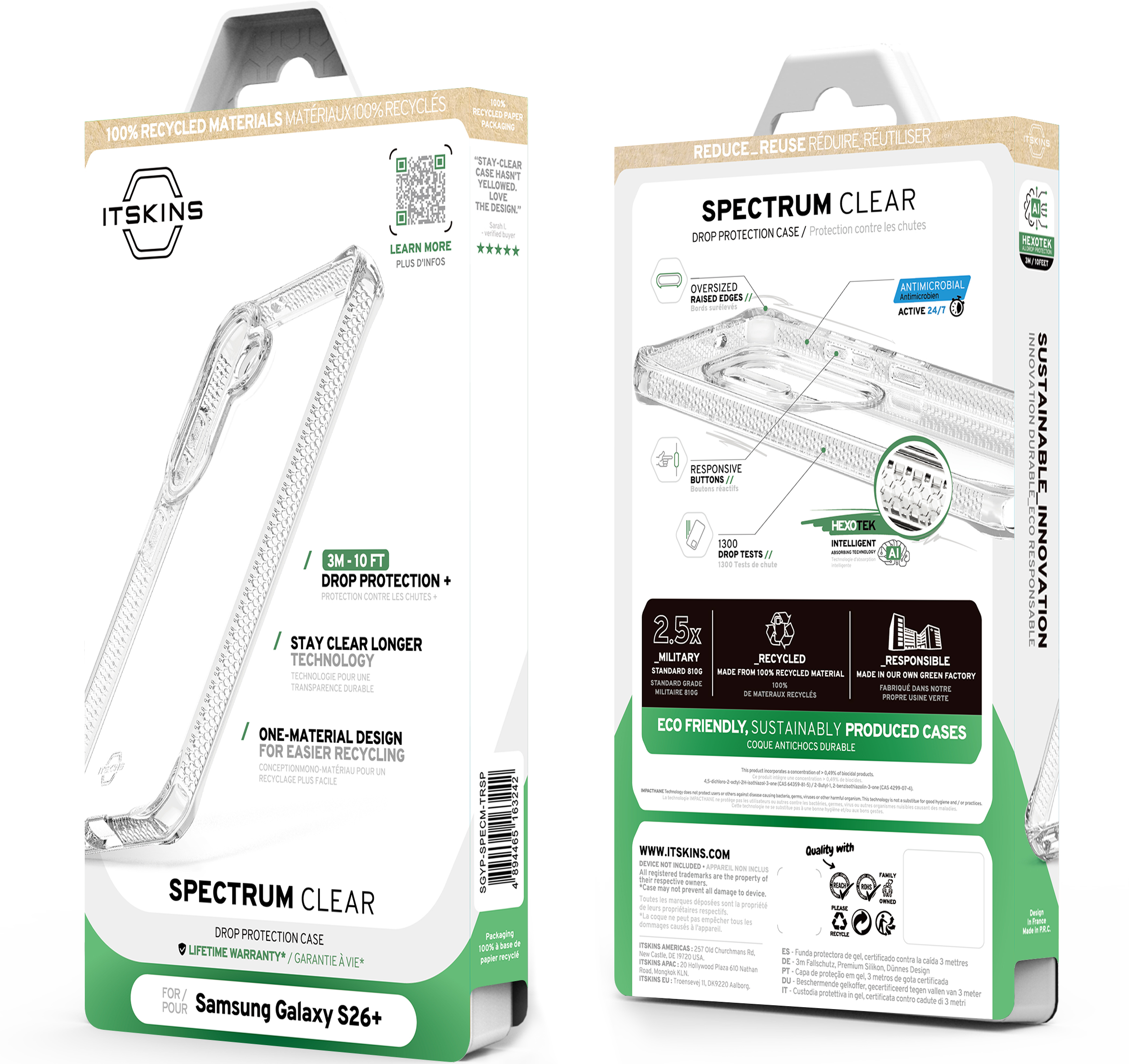 SPECTRUM_R CLEAR : Proprietary True Clear, Certified 100% Recycled, Mono-Material for Simplified Recycling. Offers AI-Enhanced Drop Protection up to 3M / 10FT, Superior Anti-Yellowing, and Antimicrobial Defense.