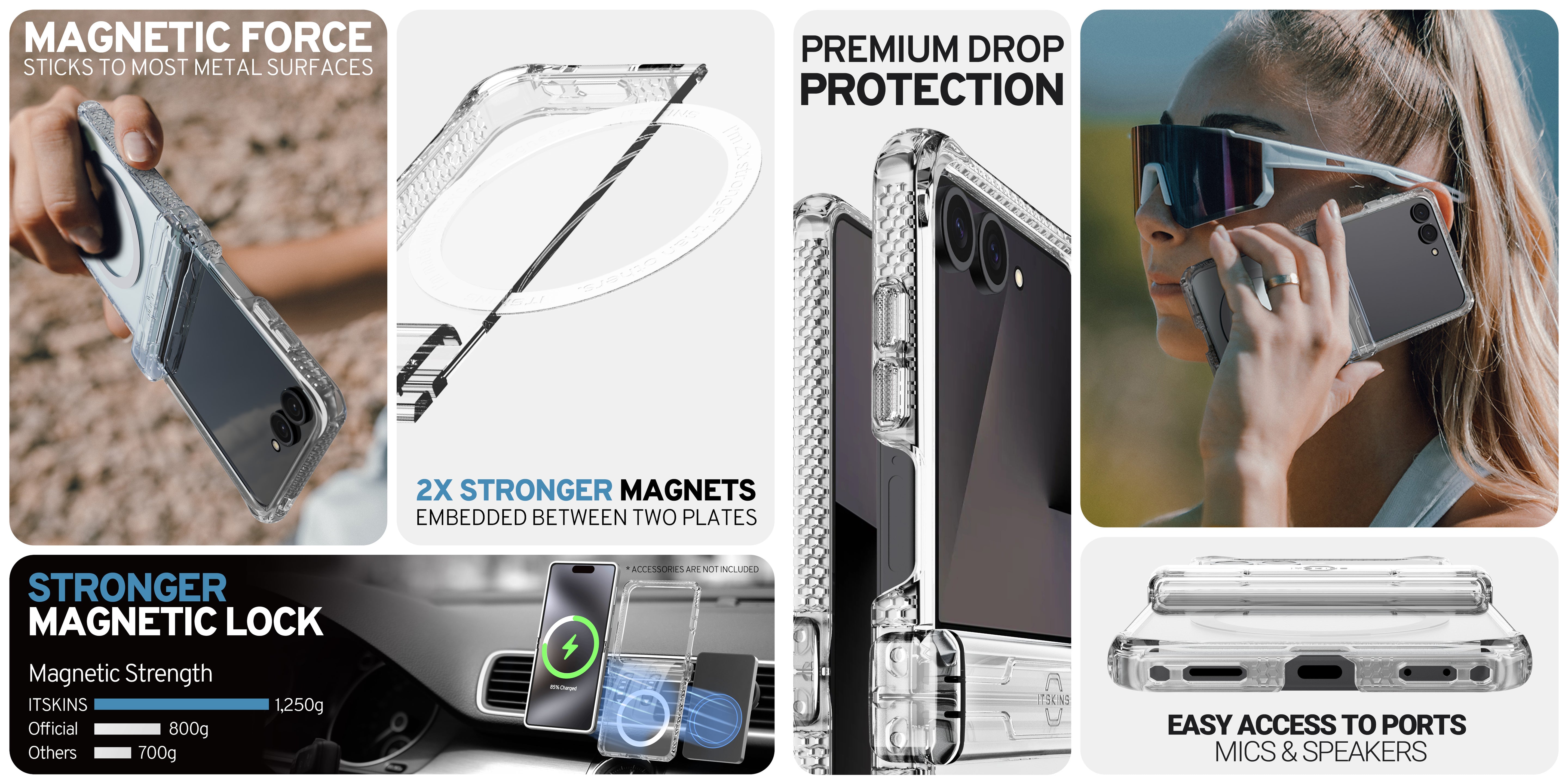 HYBRID_R // HINGE CLEAR Made from recycled materials, this slim, crystal-clear case lets you show off your phone’s premium design. It offers premium drop protection – up to 3M / 10 feet and ensures complete 360 protection of your device with a removable hinge feature. The hinge stays covered, and This also allows you to open and close your phone with each case stays in place with an innovative magnetic system.
